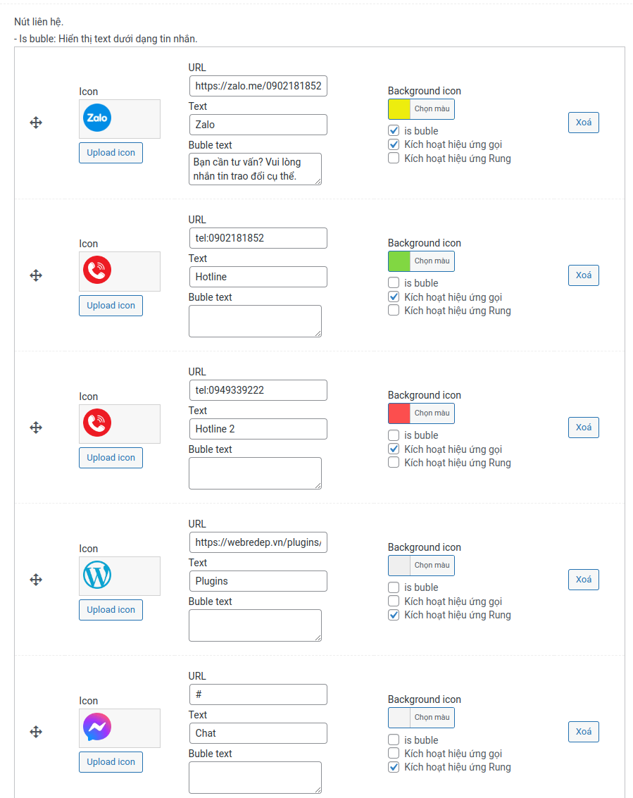 - Tuỳ chỉnh icon liên hệ, màu sắc nút, link liên hệ, chiều rộng của ảnh